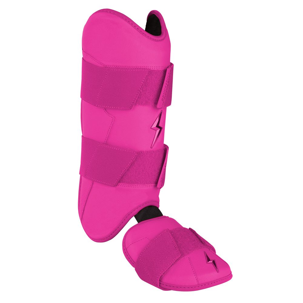 BRUCE BOLT’s PREMIUM PRO Ambidextrous Leg & Ankle Guards feature a semi-moldable thermoplastic protective shell with a Cabretta leather outer and Shark Skin inner to keep the guard in place at the plate and while running the bases.? 2 wide removable elastic straps locks the Leg guard in place providing maximum protection at the plate.